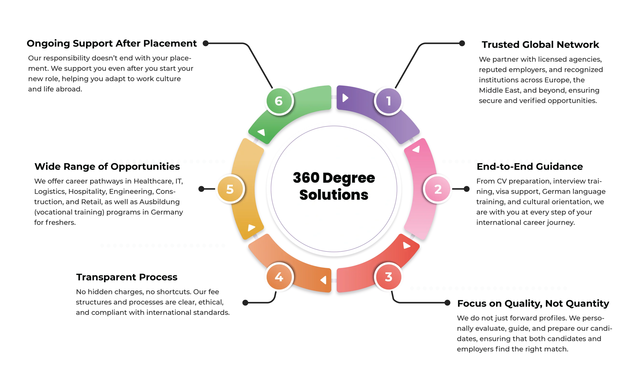 Our comprehensive 360 Degree recruitment solutions ensurethe smooth transition for a skilled worker to an international career with dedicated language training, cultural integration, and immigration support